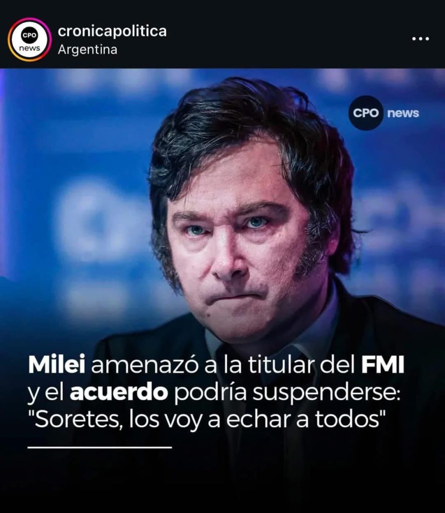 De mayor gravedad es el reciente escándalo surgido en torno a la figura y la actuación de Milei. Desde su cuenta oficial de X, Milei hizo un llamamiento público a invertir en una criptomoneda -LIBRA- que recibió millones de dólares en minutos y se derrumbó inmediatamente (3). En relación al asunto se han hecho públicas conversaciones y planificaciones con los duelos de esta criptomoneda, que apuntarían a una clara actitud delictiva por parte e Javier Milei. Dada esta situación, la oposición ha pedido la apertura de un juicio político contra el presidente (4) , de salir adelante esta iniciativa y ser declarado culpable, Milei sería expulsado inmediatamente la presidencia de Argentina, cargo que pasaría a ocupar la actual vice-presidente Victoria Villarruel. Agrava la condenable acción y el grado de absoluta irresponsabilidad de Javier Milei el hecho de que en estos momentos su gobierno esté negociando la concesión de un préstamo por parte del FMI de entre 11 y 15.000 millones de dólares, y esta actuación fraudulenta de la máxima autoridad argentina, puede ser determinante para la no concesión del mismo por parte, lo que provocaría una situación insostenible para la Casa Rosada. Luis “Toto” Caputo, el ministro de Economía argentino y encargado de llevar las negociaciones con el FMI así lo ha manifestado (5).
